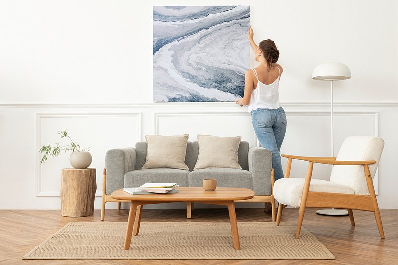 Woman arranging frame mockup png on a wall in a Japandi decor room https://www.rawpixel.com/image/3347146/free-illustration-png-mockup-living-room-frameView license