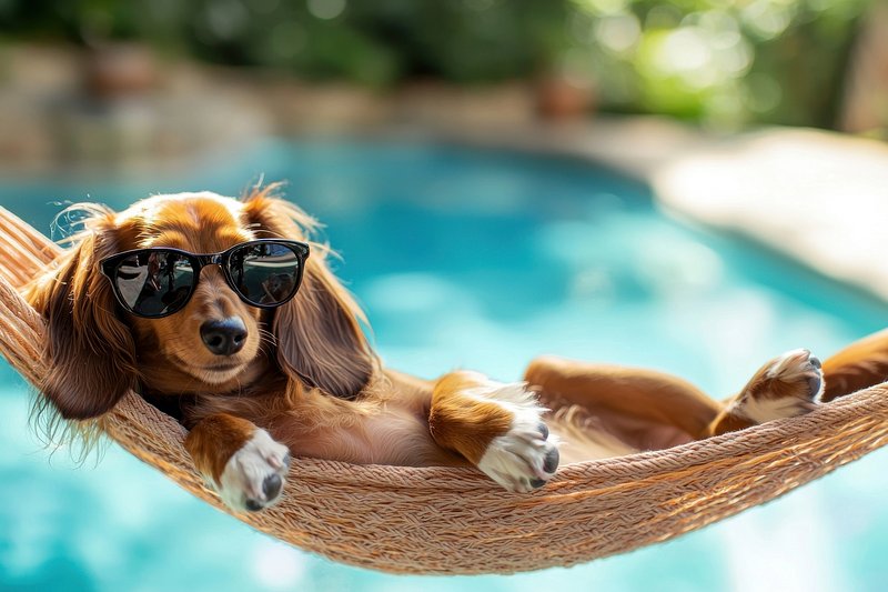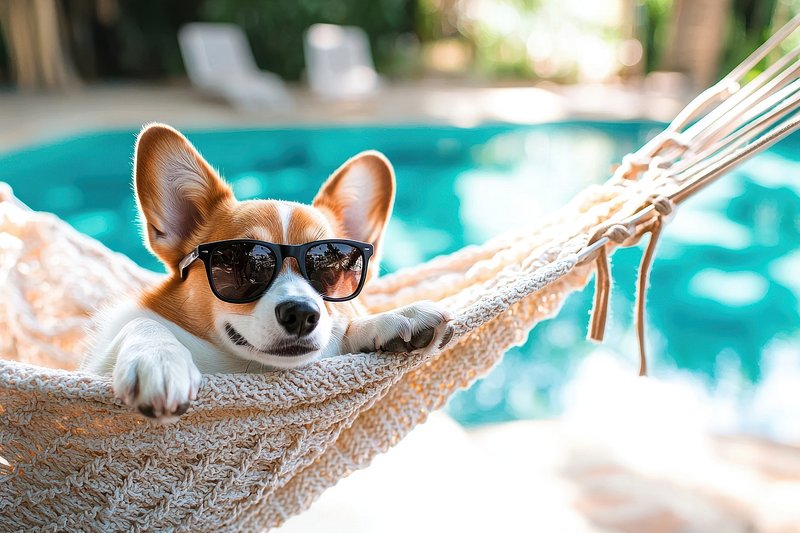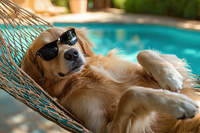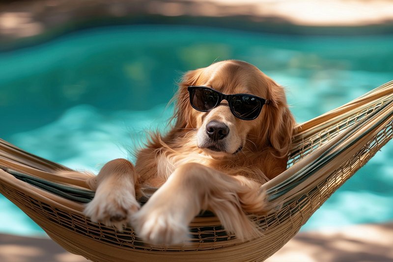 Dog relaxing in hammock poolside. https://www.rawpixel.com/image/25629403/dog-relaxing-hammock-poolsideView license