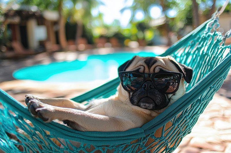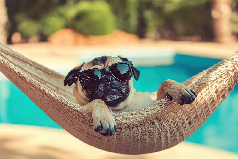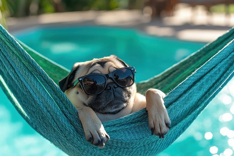 Pug relaxing in hammock poolside. https://www.rawpixel.com/image/25629386/pug-relaxing-hammock-poolsideView license