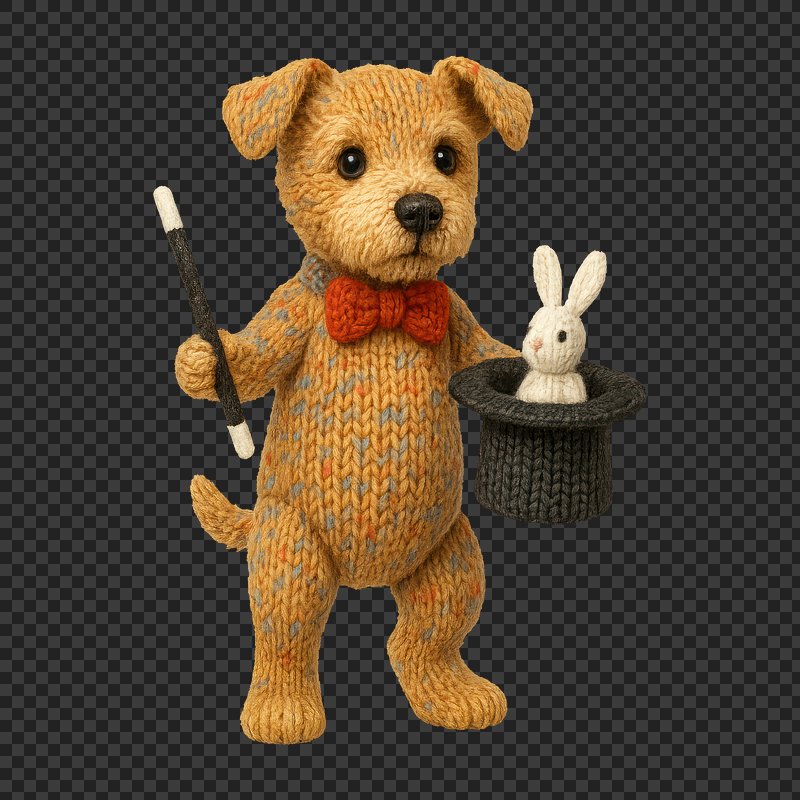 PNG Knitted dog magician performs magic. https://www.rawpixel.com/image/24441820/png-knitted-dog-magician-performs-magicView license