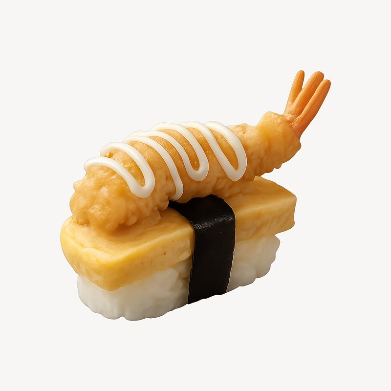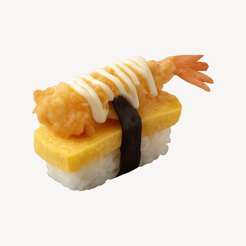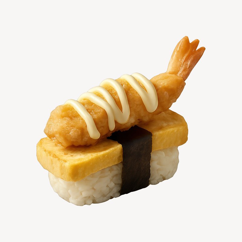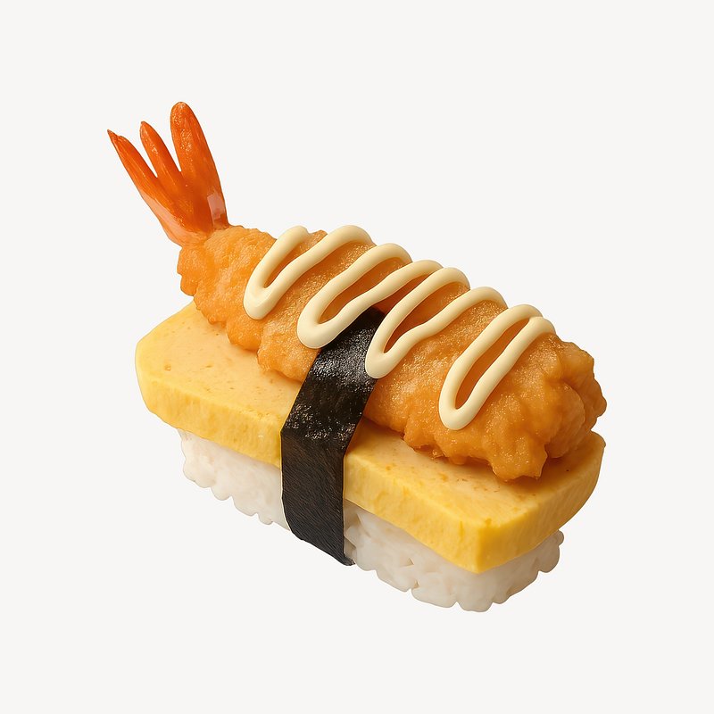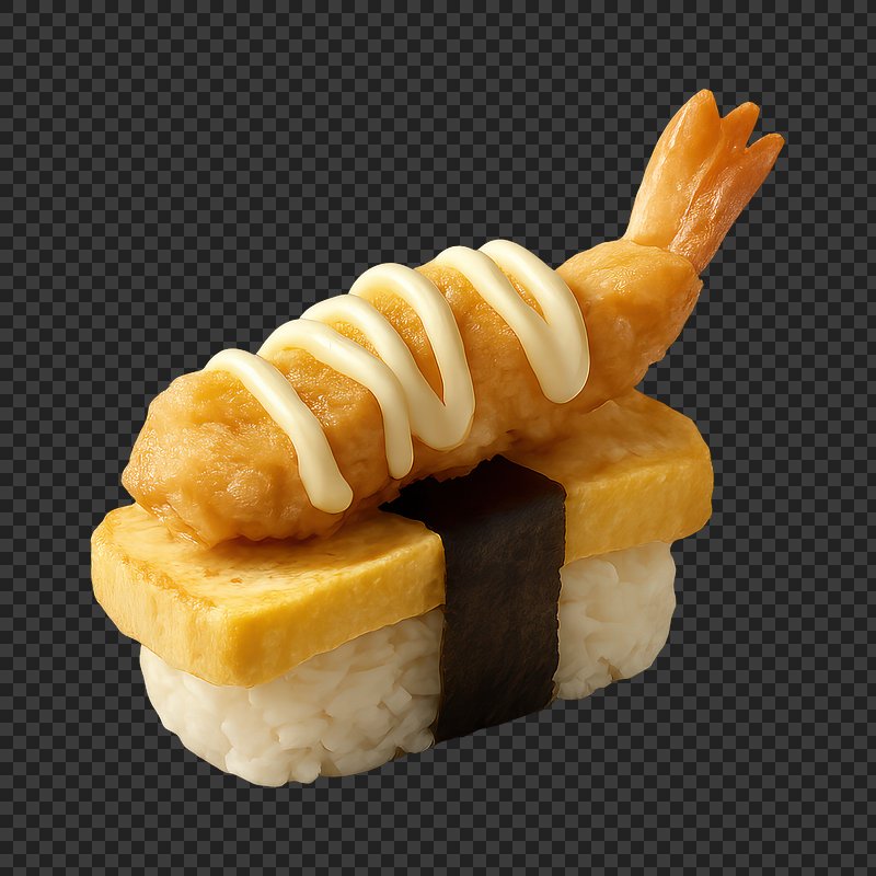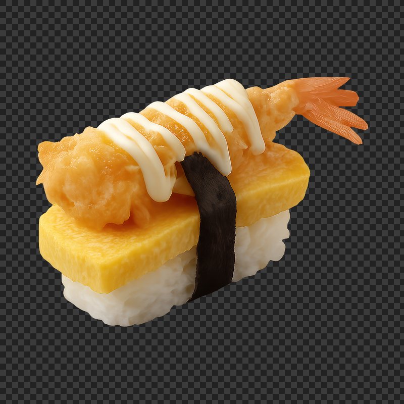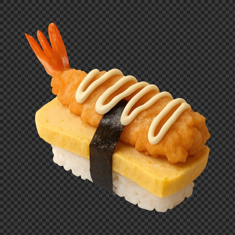 PNG Tempura shrimp sushi delicacy. https://www.rawpixel.com/image/19072742/png-tempura-shrimp-sushi-delicacyView license