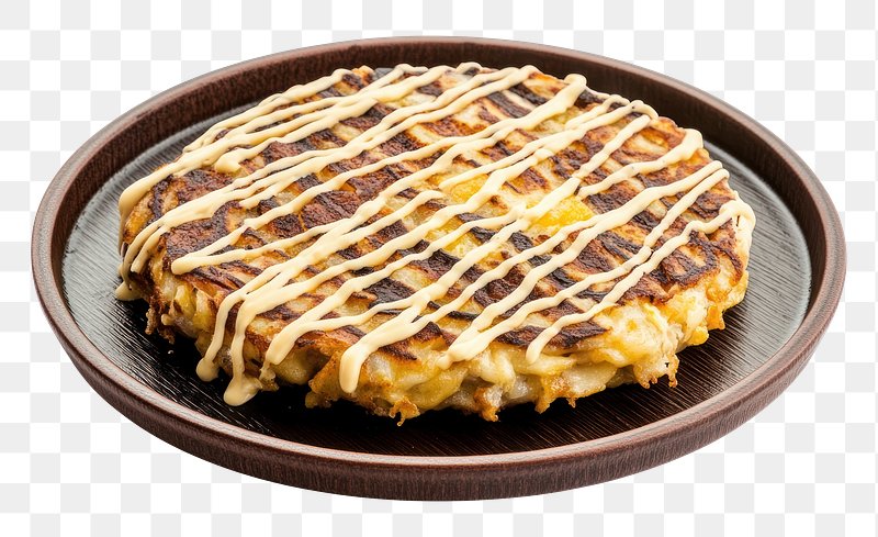 PNG A japanese okonomiyaki on a plate pancake food dish. https://www.rawpixel.com/image/16935114/png-japanese-okonomiyaki-plate-pancake-food-dishView license