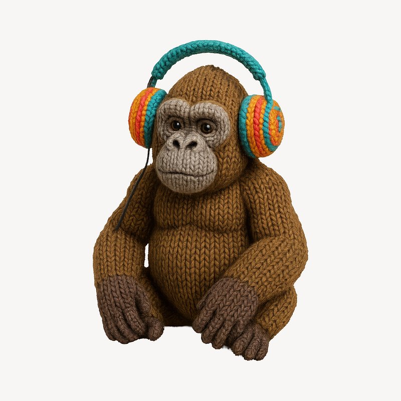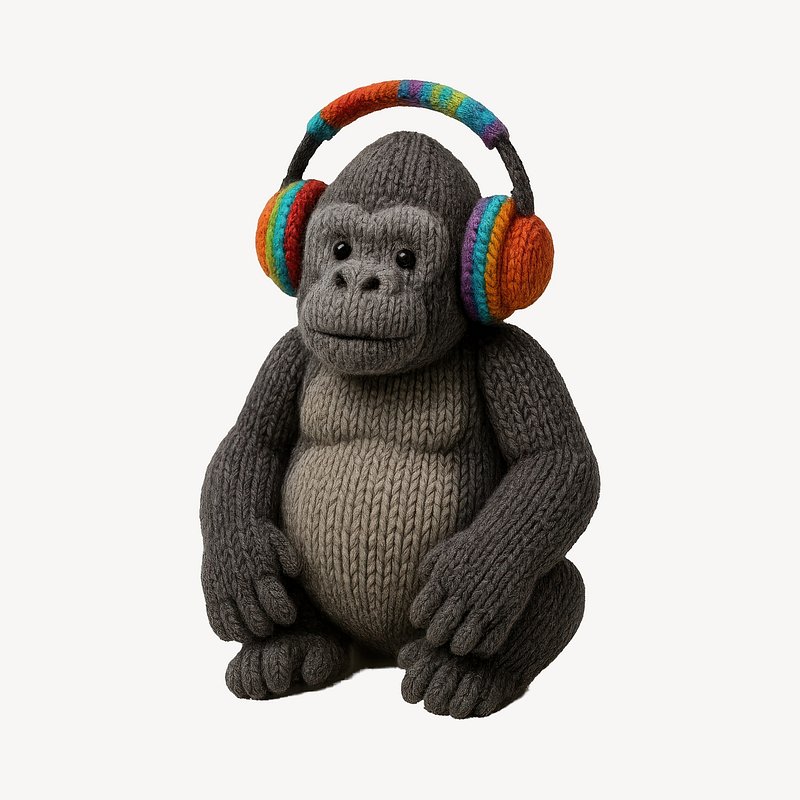 Knitted gorilla wearing colorful headphones. https://www.rawpixel.com/image/24607837/knitted-gorilla-wearing-colorful-headphonesView license