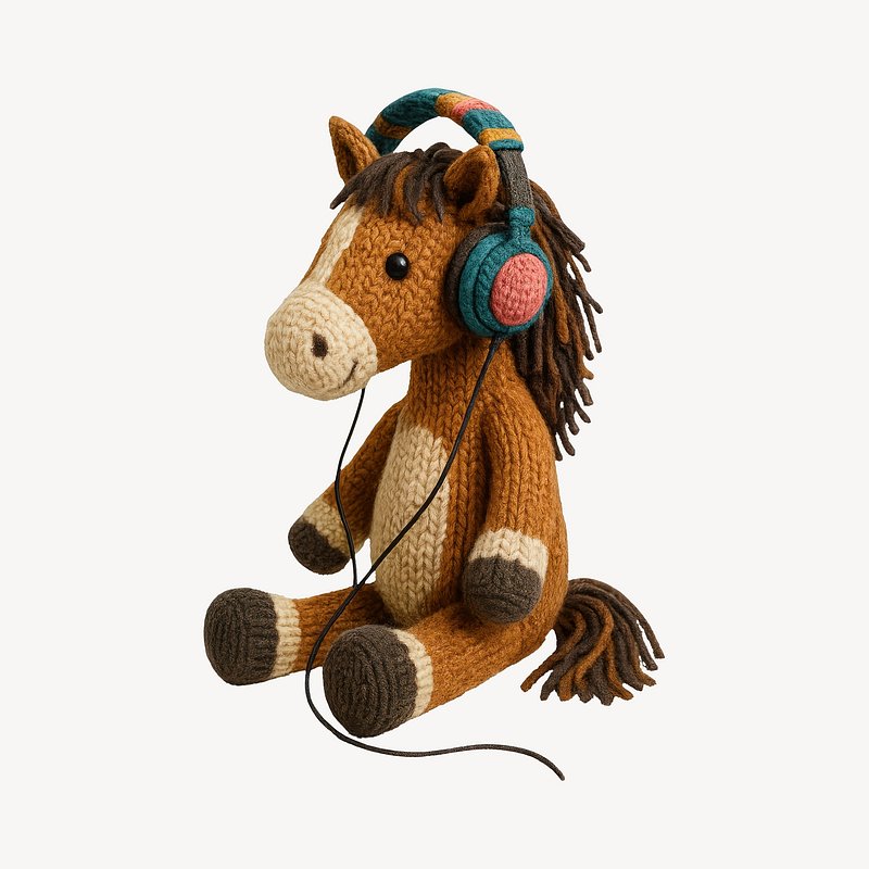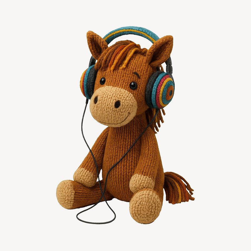 Knitted horse wearing headphones. https://www.rawpixel.com/image/24661461/knitted-horse-wearing-headphonesView license