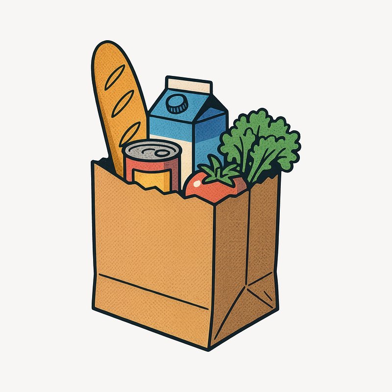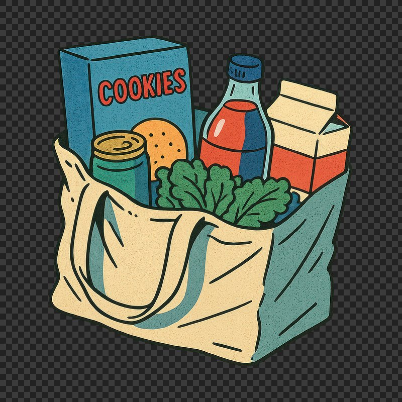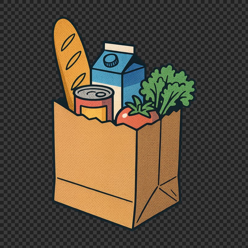 PNG Grocery bag illustration with essentials. https://www.rawpixel.com/image/24632172/png-grocery-bag-illustration-with-essentialsView license