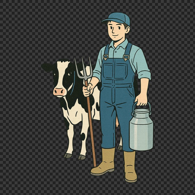 PNG Cartoon farmer with cow. https://www.rawpixel.com/image/24671528/png-cartoon-farmer-with-cowView license