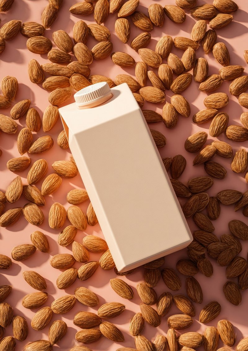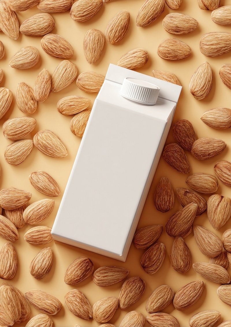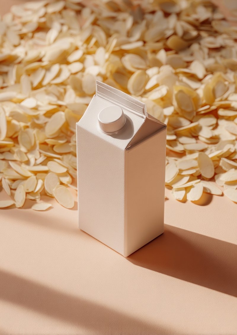 Almond milk carton surrounded almonds. https://www.rawpixel.com/image/24713944/almond-milk-carton-surrounded-almondsView license