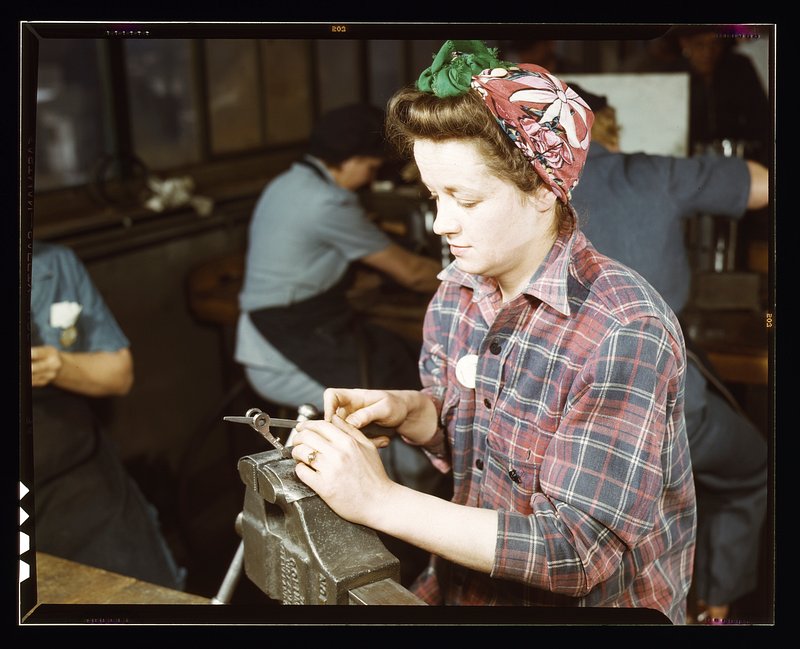 One of the girls of Vilter Manufacturing Co. filing small gun parts, Milwaukee, Wisc. One brother in Coast Guard, one going… https://www.rawpixel.com/image/7506224/photo-image-person-man-vintageFree Image from public domain license