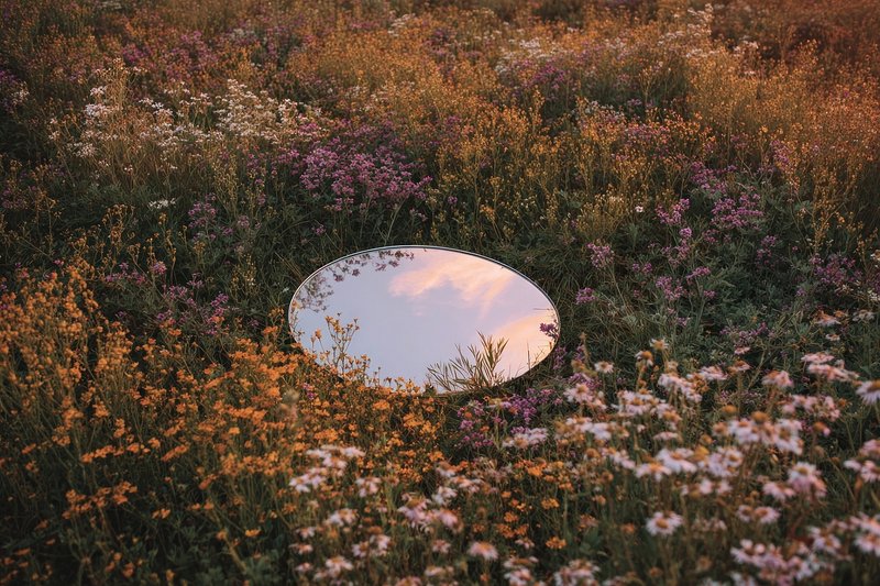 Mirror reflects sky amidst flowers. https://www.rawpixel.com/image/25471337/mirror-reflects-sky-amidst-flowersView license