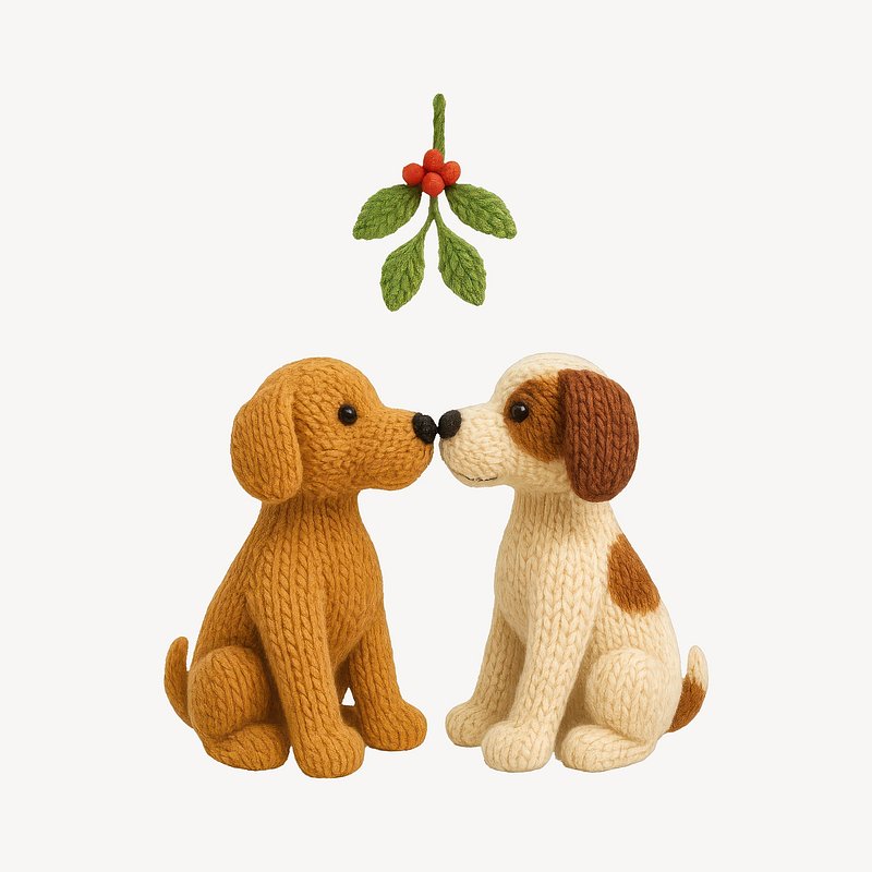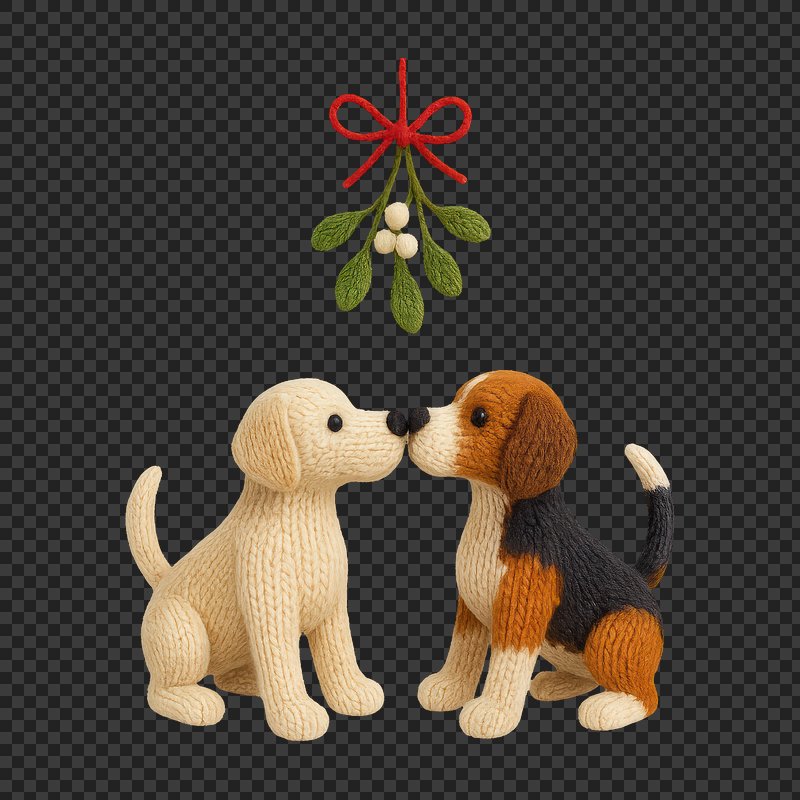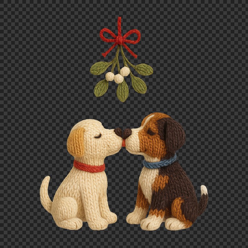 PNG Knitted dogs kissing mistletoe. https://www.rawpixel.com/image/24441699/png-knitted-dogs-kissing-mistletoeView license