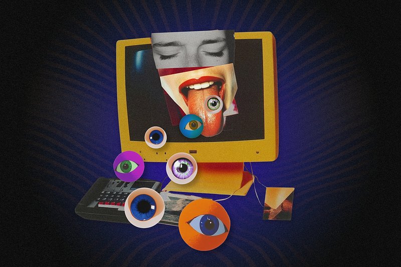 Surreal collage with a vintage computer, colorful eyes, and abstract elements retro vintage collage template design https://www.rawpixel.com/image/22773468/image-png-torn-paper-cutView license