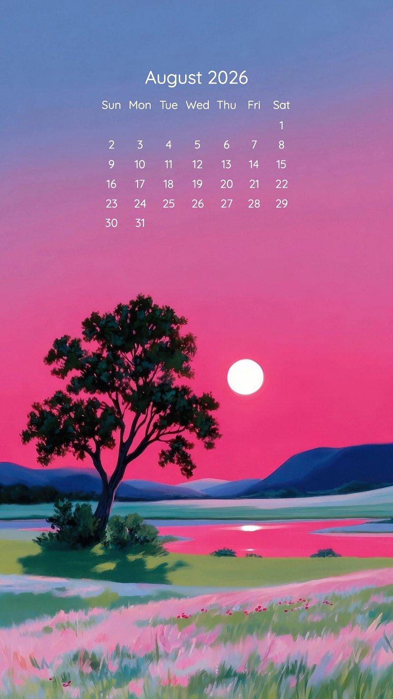 Vintage August 2026 calendar mobile wallpaper, original illustration by Ralph Meriman https://www.rawpixel.com/image/24704190/image-wallpaper-iphone-mobileView license
