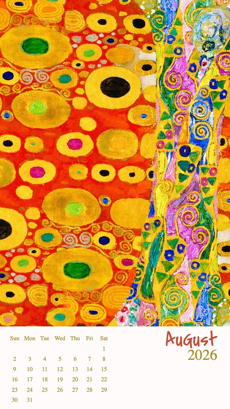 August 2026 art calendar mobile wallpaper, original artwork by Gustav Klimt https://www.rawpixel.com/image/24703299/august-2026-art-calendar-mobile-wallpaper-original-artwork-gustav-klimtView license