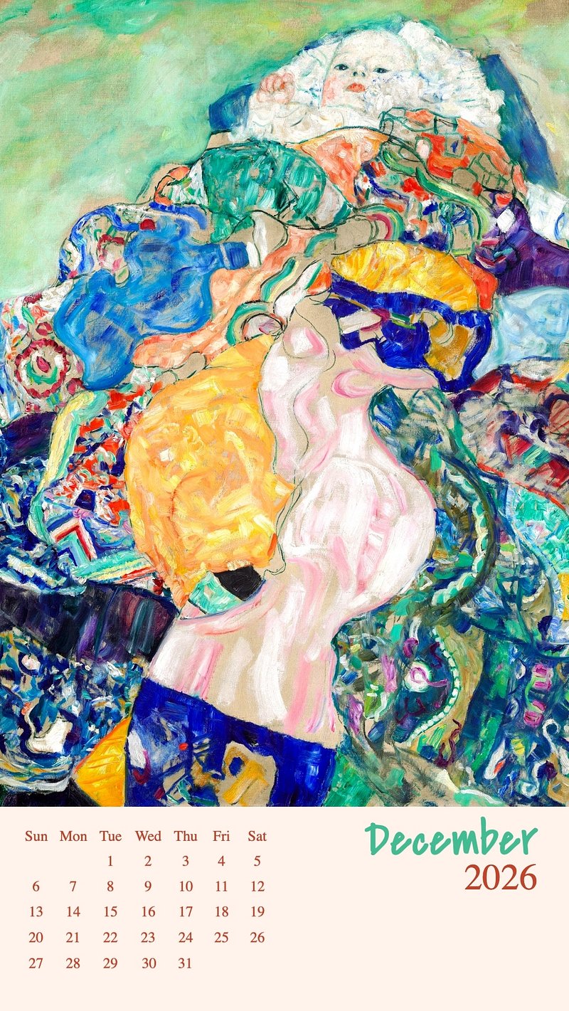 December 2026 art calendar mobile wallpaper, original artwork by Gustav Klimt https://www.rawpixel.com/image/24703306/december-2026-art-calendar-mobile-wallpaper-original-artwork-gustav-klimtView license