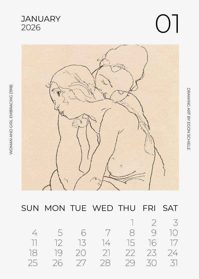 2026 January art calendar, original artwork by Egon Schiele https://www.rawpixel.com/image/24739537/2026-january-art-calendar-original-artwork-egon-schieleView license