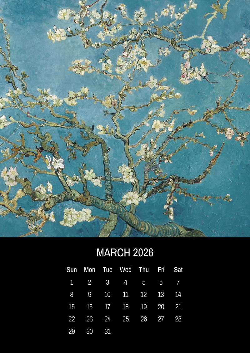 2026 March art calendar, original artwork by Vincent van Gogh https://www.rawpixel.com/image/24704672/2026-march-art-calendar-original-artwork-vincent-van-goghView license