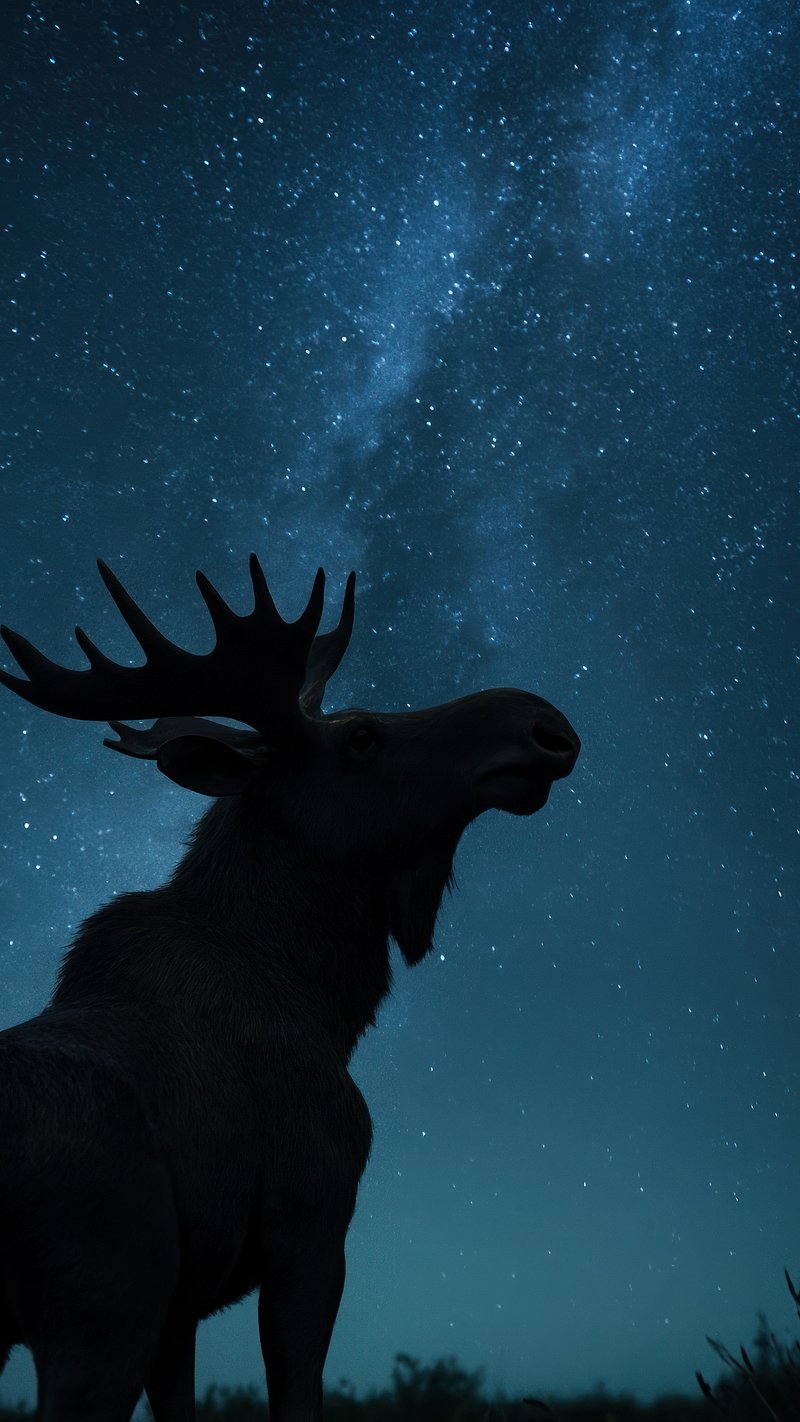 Moose silhouette under starry sky. https://www.rawpixel.com/image/18163795/moose-silhouette-under-starry-skyView license