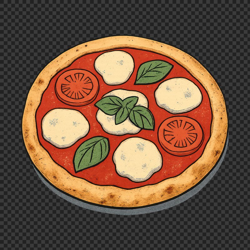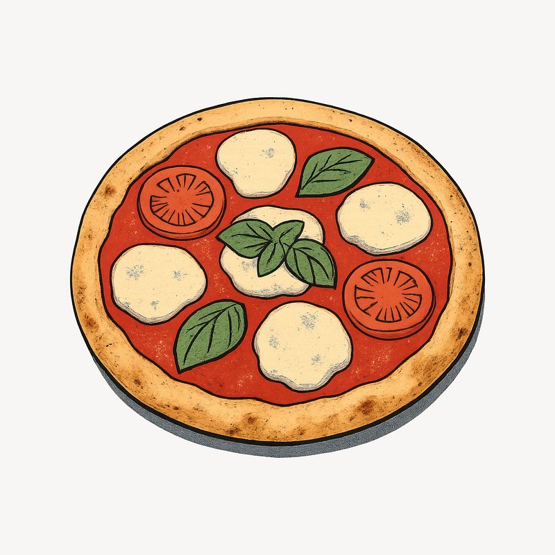 Illustrated classic Margherita pizza. https://www.rawpixel.com/image/24717622/illustrated-classic-margherita-pizzaView license