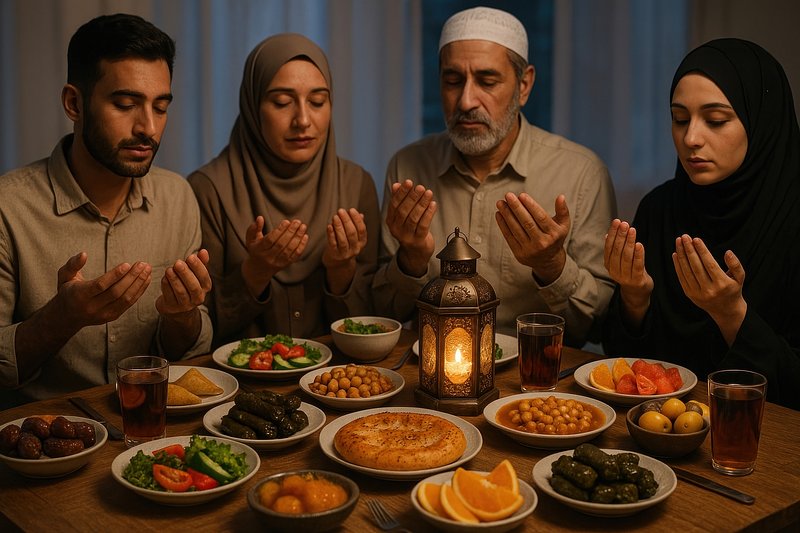 Family praying before Iftar meal. https://www.rawpixel.com/image/17507572/family-praying-before-iftar-mealView license
