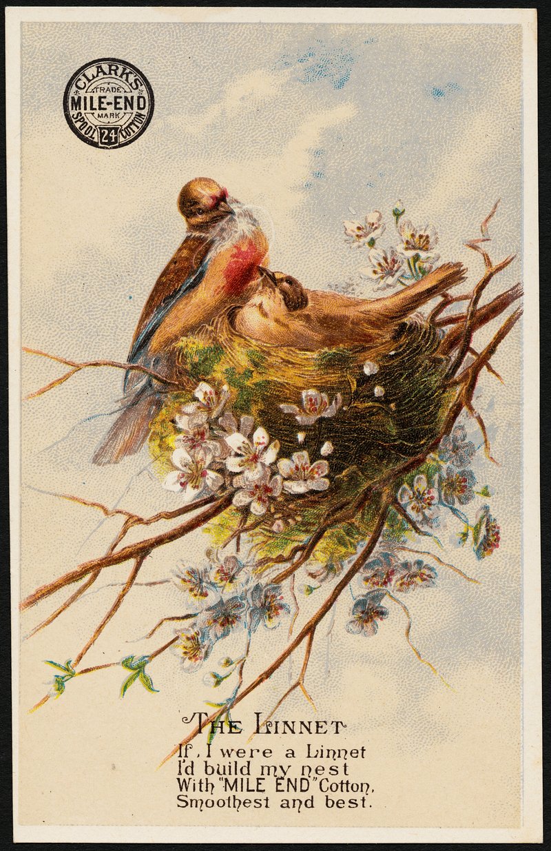 Clark's Mile-End 24 Spool Cotton. The Linnet. If I were a linnet, I'd built my next with "mile end' cotton. Smoothest and… https://www.rawpixel.com/image/8908789/image-art-vintage-public-domainFree Image from public domain license