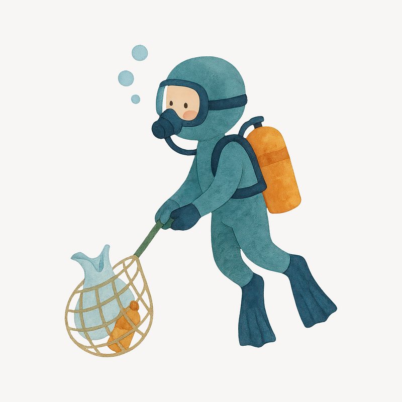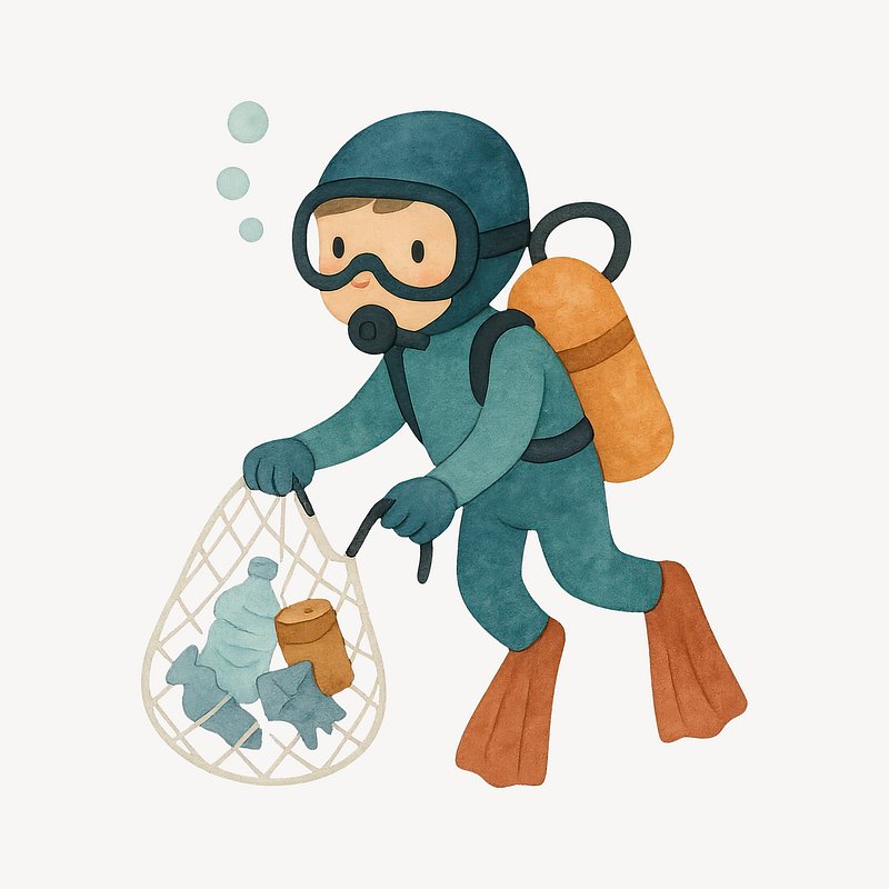 Diver collecting ocean waste illustration. https://www.rawpixel.com/image/19438165/diver-collecting-ocean-waste-illustrationView license