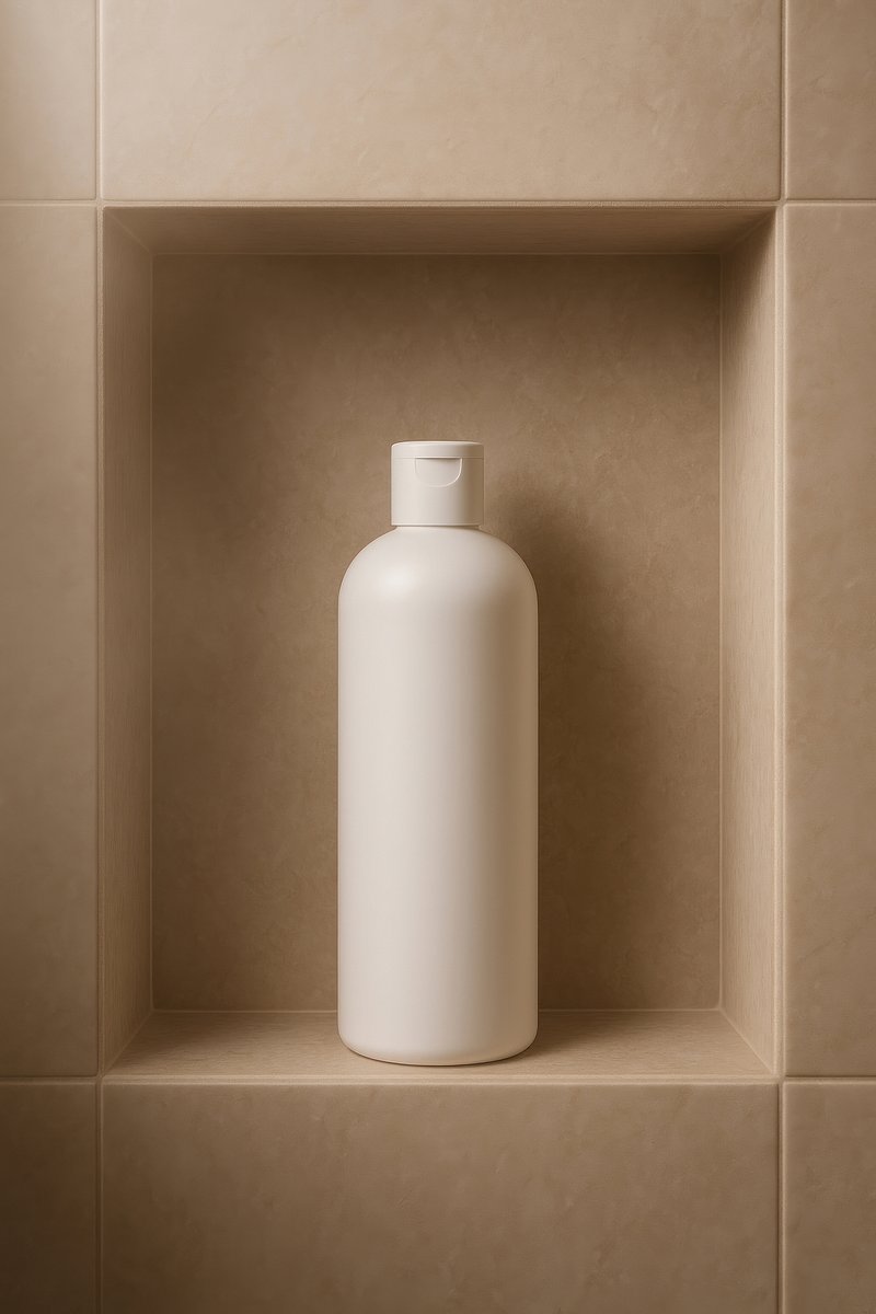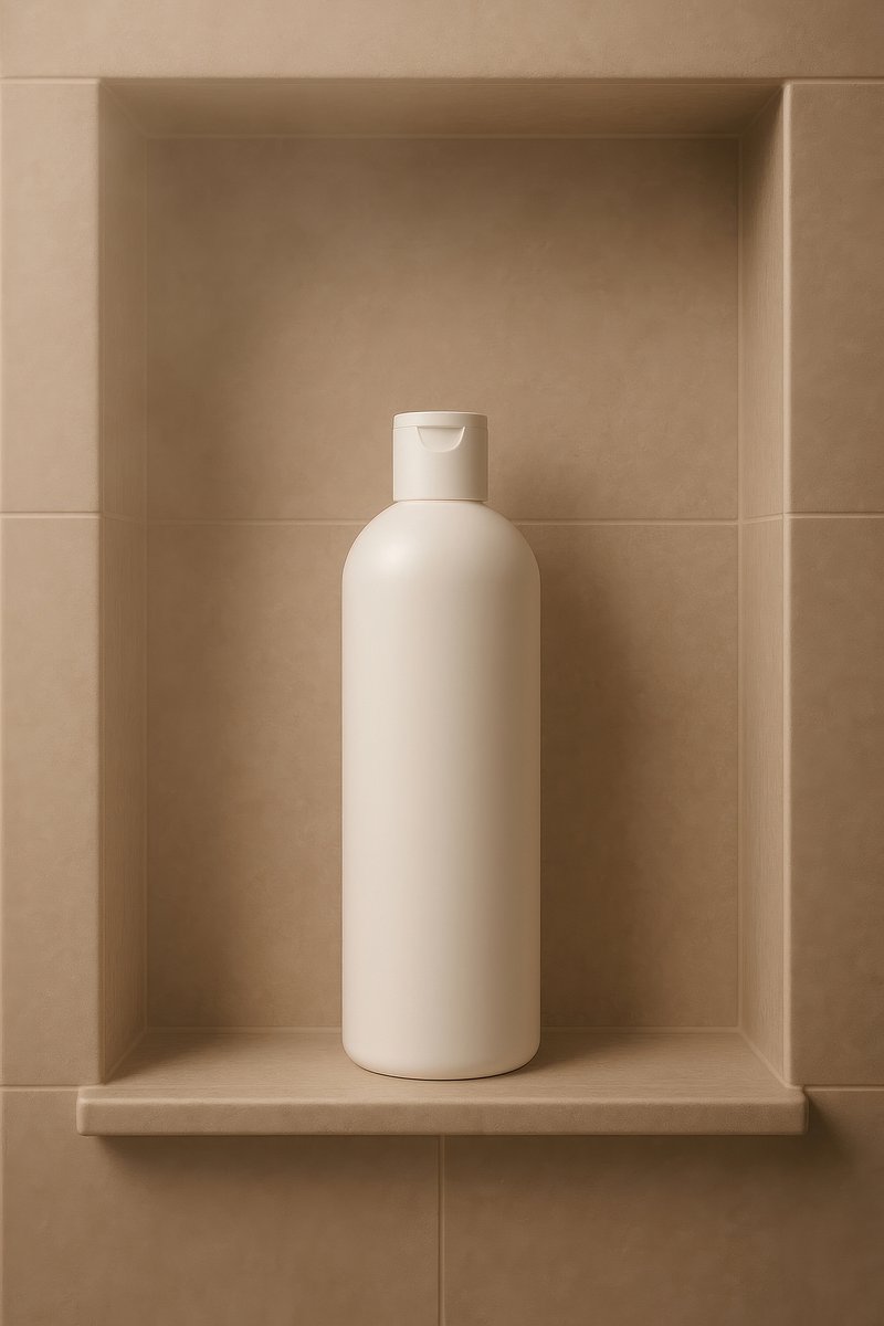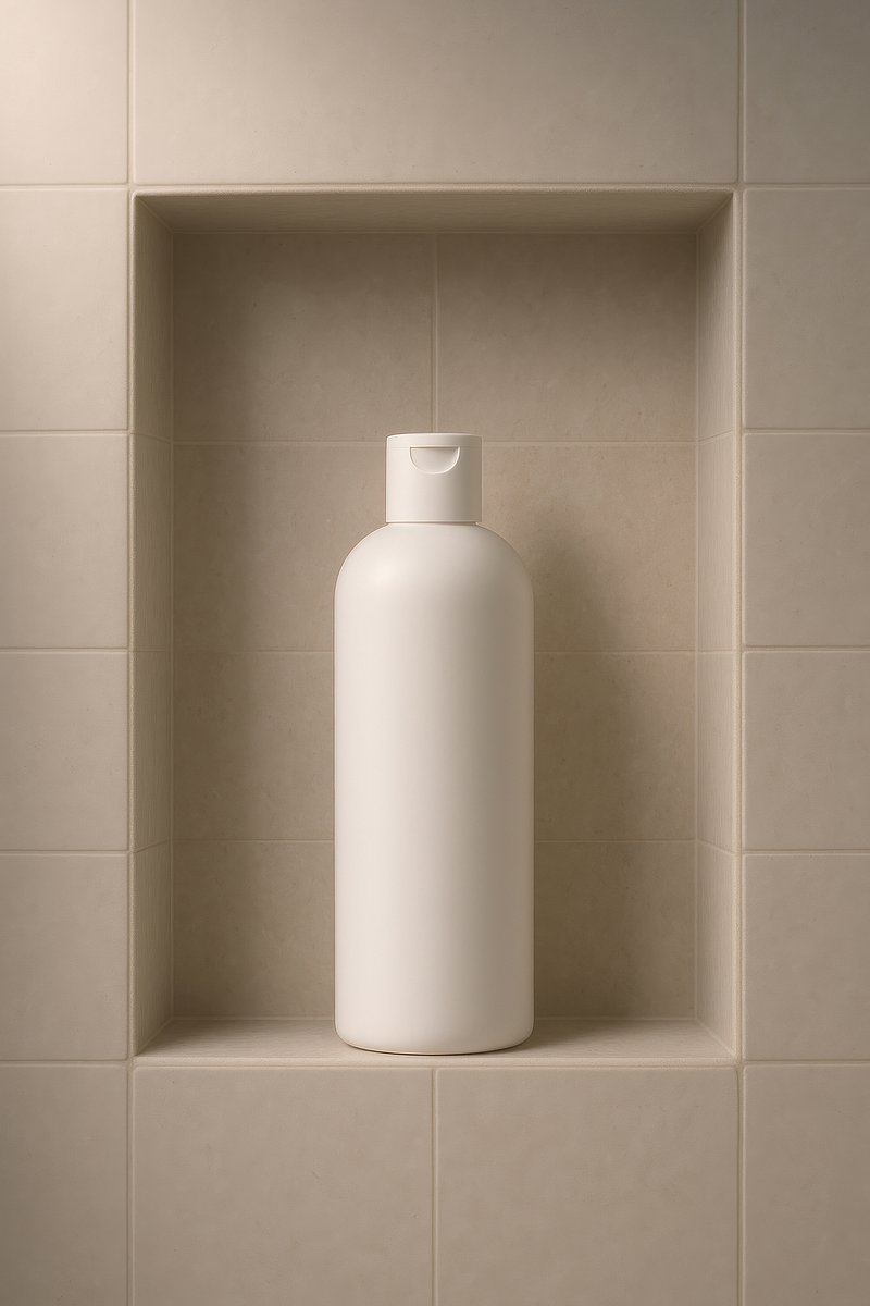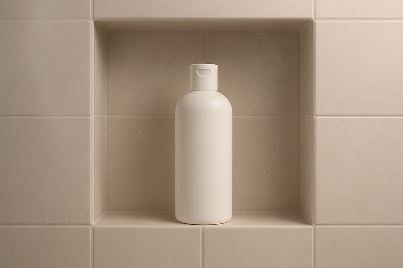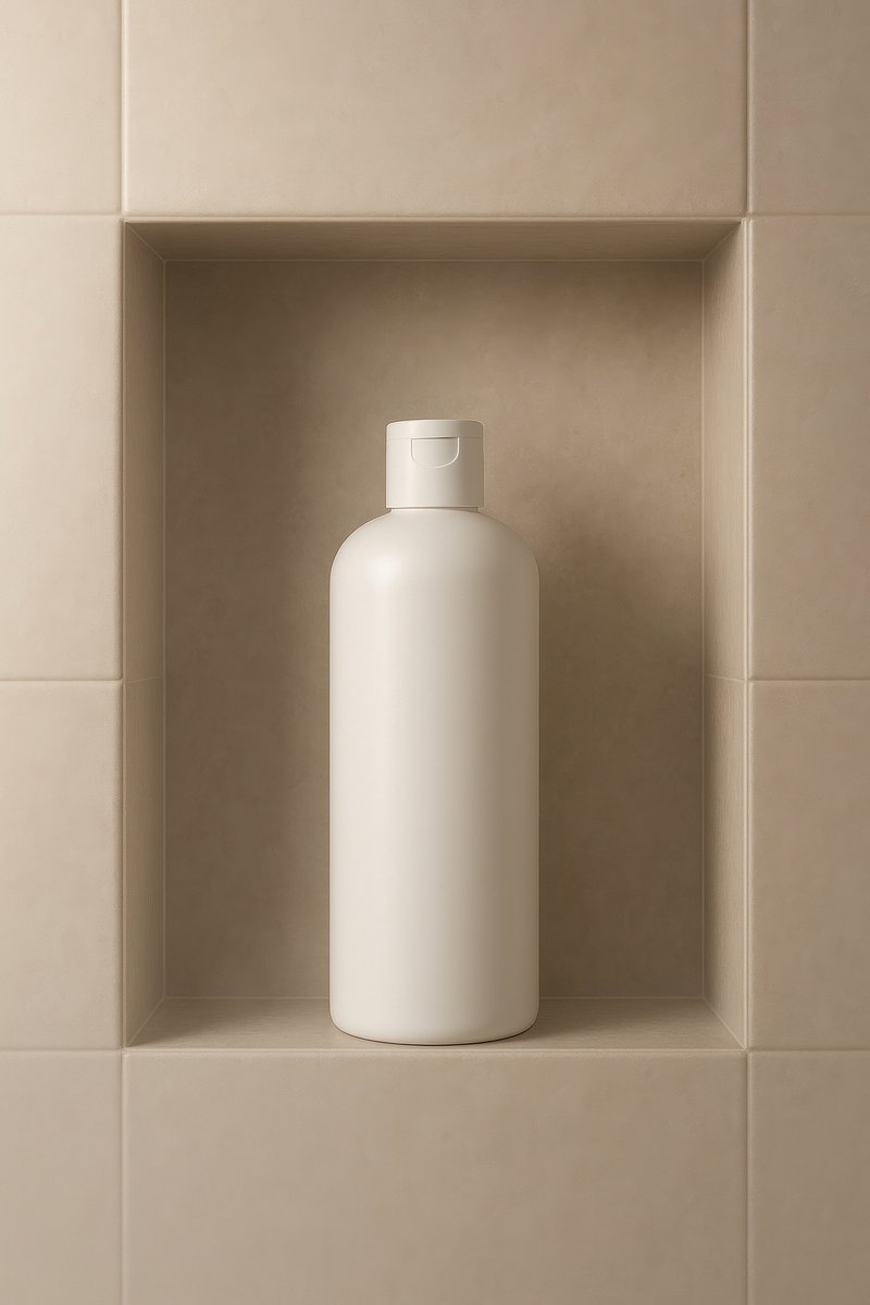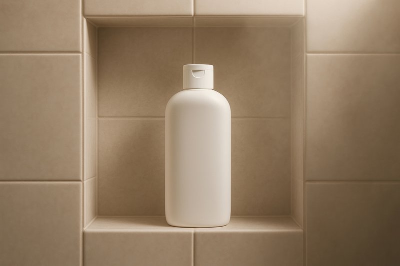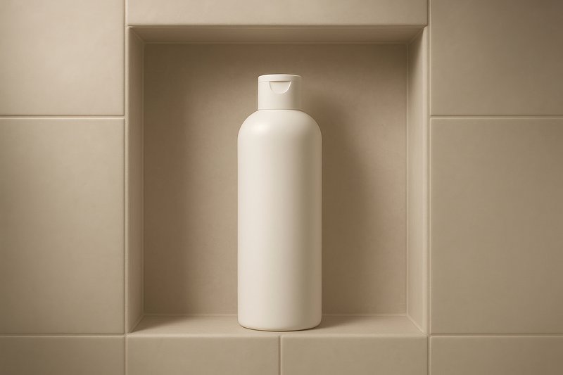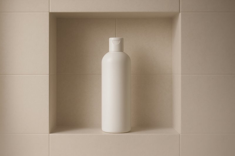 Minimalist shampoo bottle on shelf. https://www.rawpixel.com/image/24791255/minimalist-shampoo-bottle-shelfView license