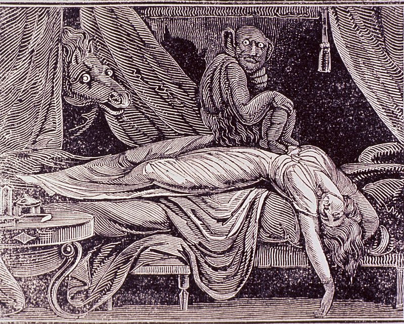 A woman fast asleep with her head hanging down, a devil is sitting on her stomach and a horse peeps through a curtain;… https://www.rawpixel.com/image/14002148/image-dog-horses-cartoonFree Image from public domain license