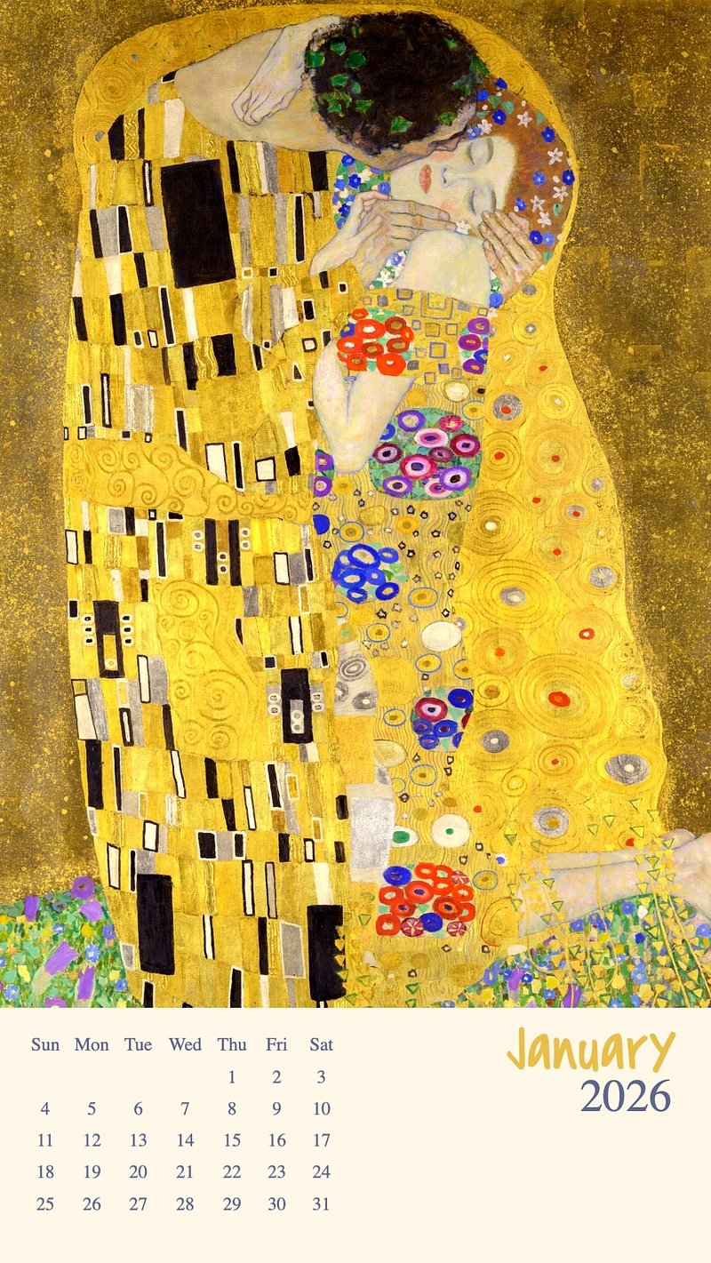 January 2026 art calendar mobile wallpaper, original artwork by Gustav Klimt https://www.rawpixel.com/image/24703295/january-2026-art-calendar-mobile-wallpaper-original-artwork-gustav-klimtView license