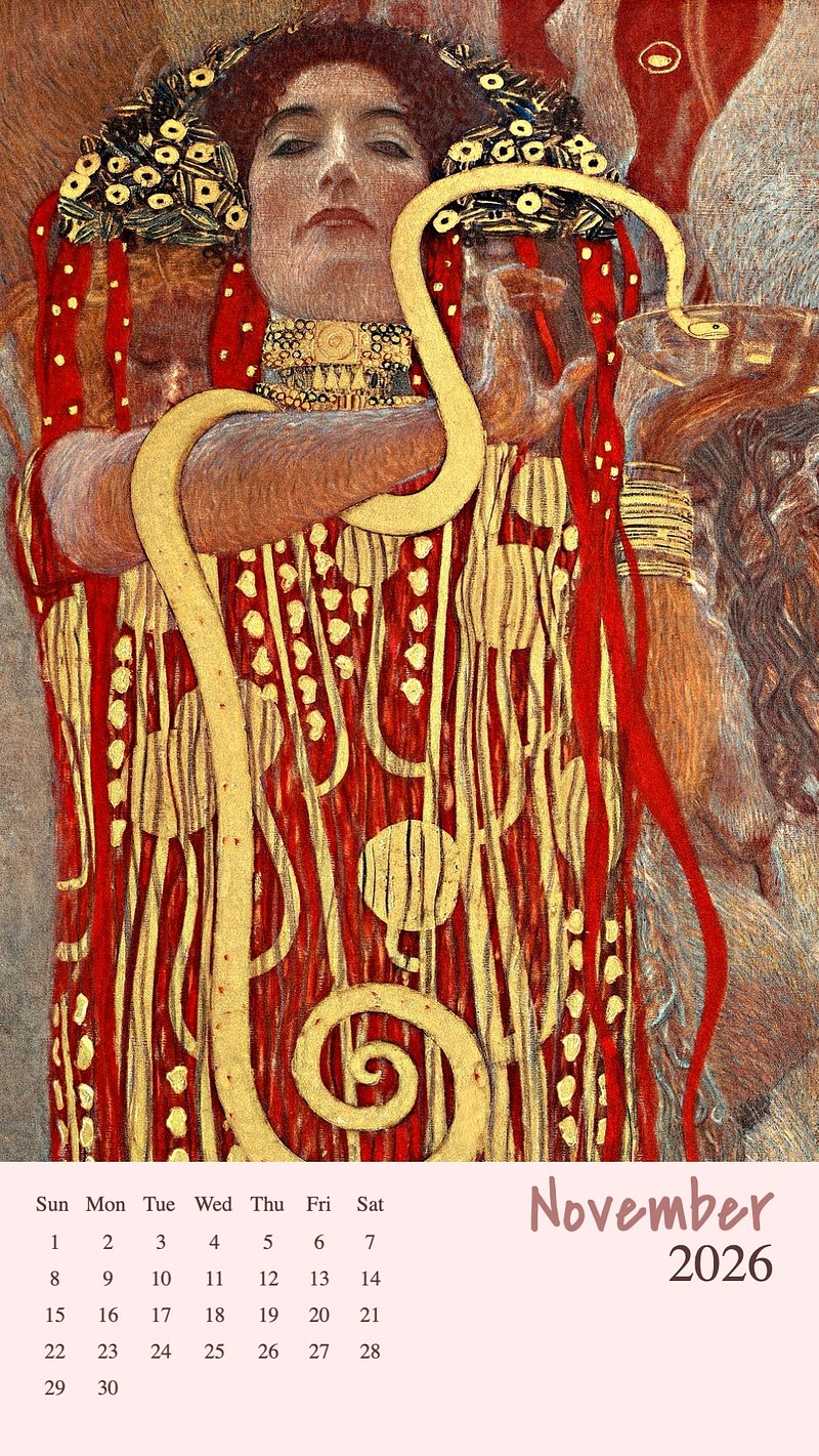 November 2026 art calendar mobile wallpaper, original artwork by Gustav Klimt https://www.rawpixel.com/image/24703298/november-2026-art-calendar-mobile-wallpaper-original-artwork-gustav-klimtView license