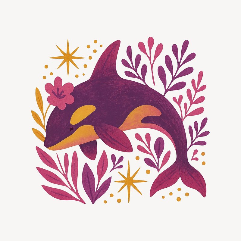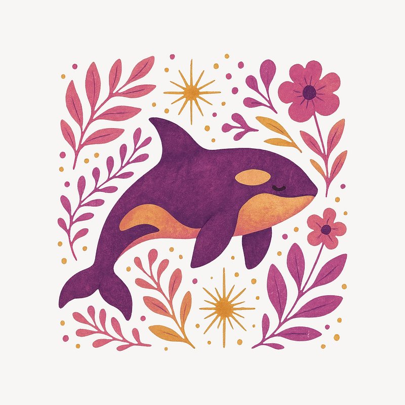 Whimsical orca surrounded by florals. https://www.rawpixel.com/image/24656903/whimsical-orca-surrounded-floralsView license