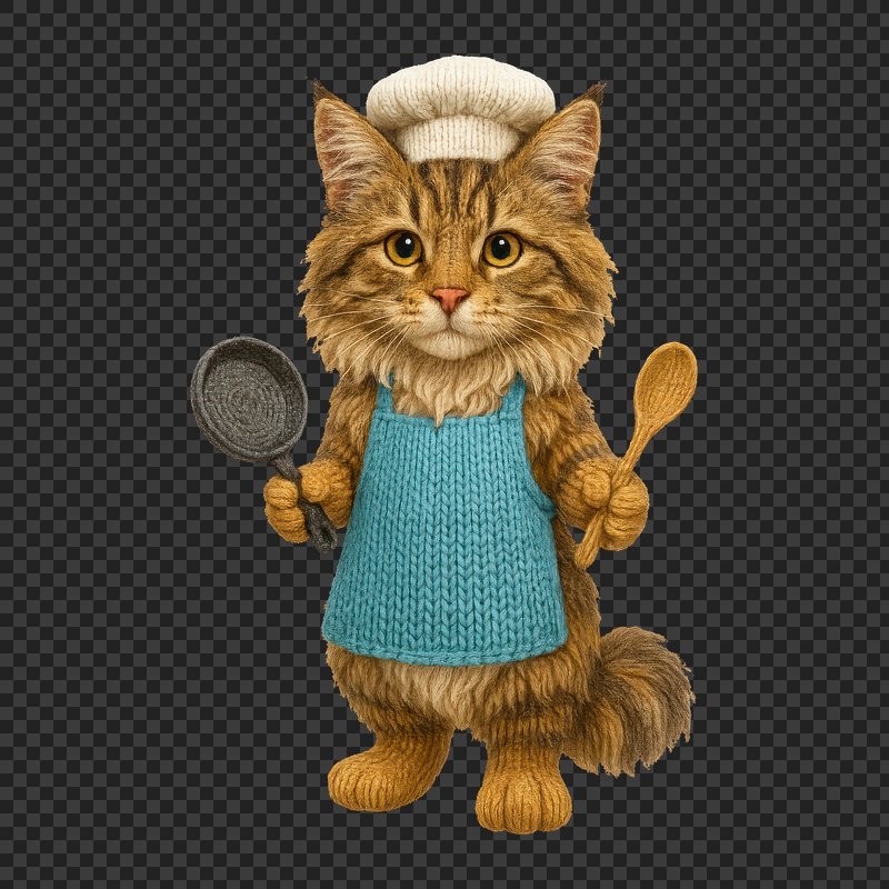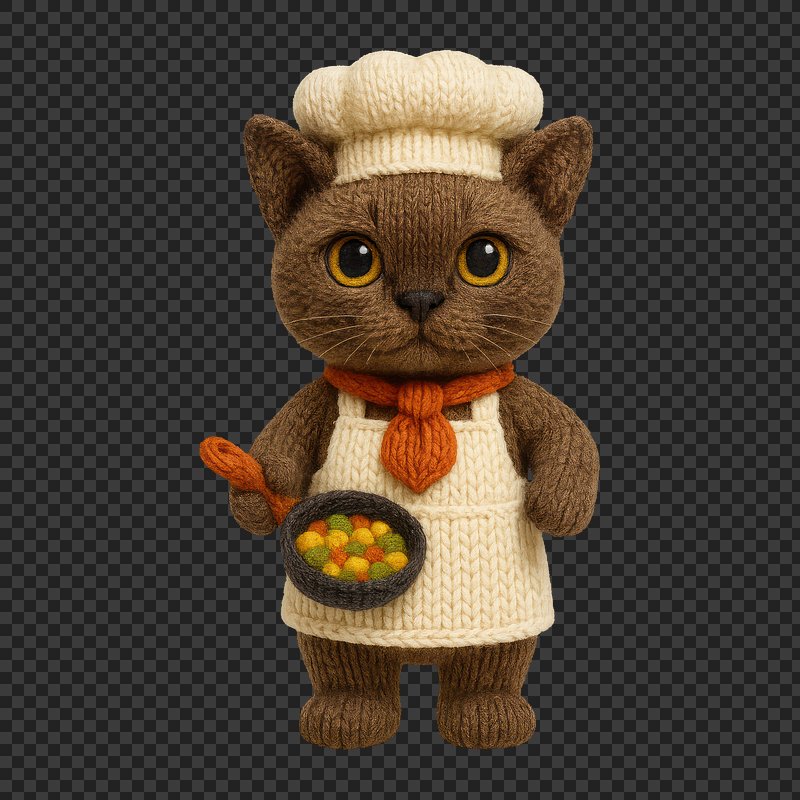 PNG Cute knitted cat chef illustration. https://www.rawpixel.com/image/24440570/png-cute-knitted-cat-chef-illustrationView license