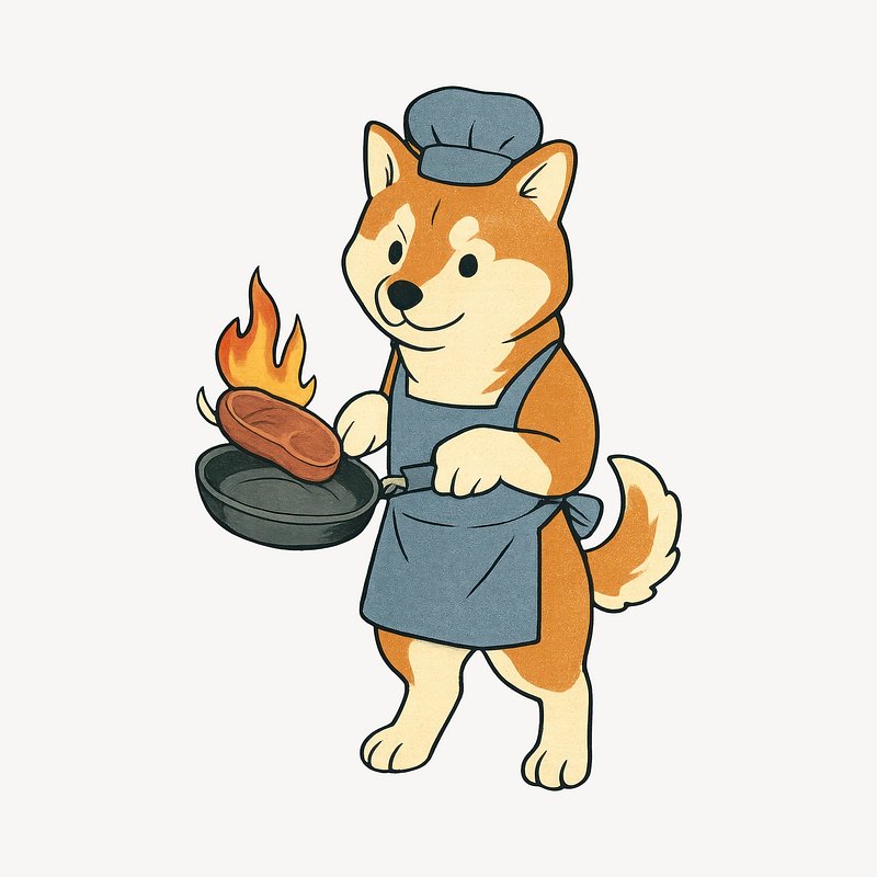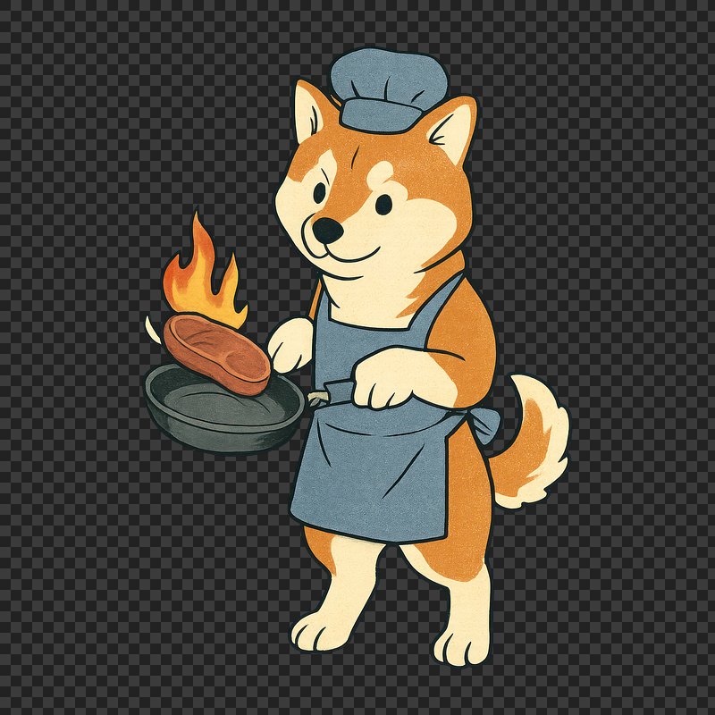 Cartoon dog chef cooking steak. https://www.rawpixel.com/image/24717077/cartoon-dog-chef-cooking-steakView license