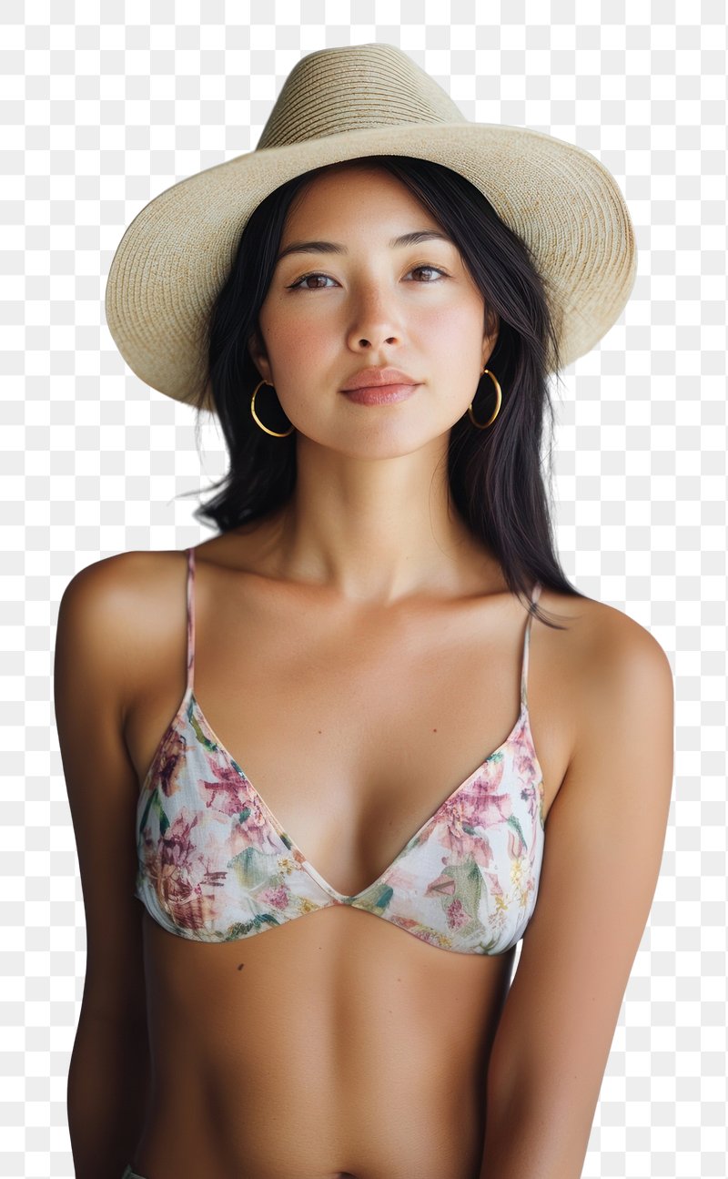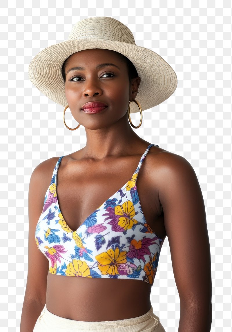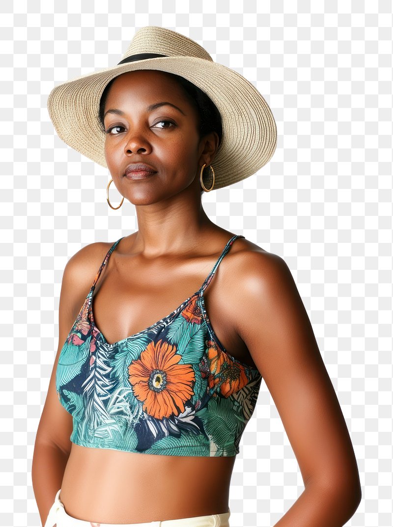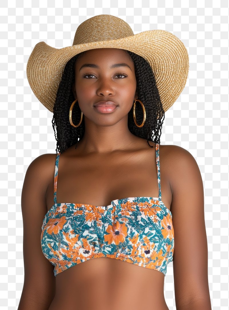 PNG Woman in her 33 years old in spaghetti strap top with ditsy print hat earrings bikini. https://www.rawpixel.com/image/17272455/png-gold-clothingView license