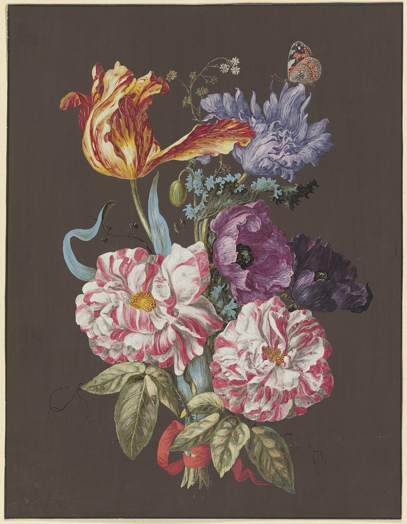 Blumengebinde mit Rosen (Rosa), Tulpen (Tulipa), Mohn (Papaver) und anderen Blumen, mit Admiral, ca. 1770 by unknown, 18th… https://www.rawpixel.com/image/18951116/image-butterfly-rosa-flowerFree Image from public domain license