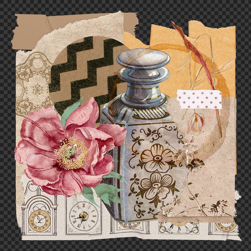 Vintage aesthetic ephemera png collage, mixed media background featuring perfume bottle and flower, transparent background https://www.rawpixel.com/image/6242564/png-torn-paper-flower-aestheticView license