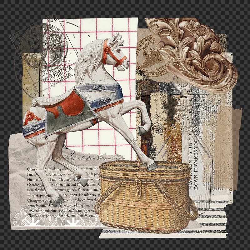 Vintage aesthetic ephemera png collage, mixed media background featuring horse and basket, transparent background https://www.rawpixel.com/image/6242542/png-torn-paper-aesthetic-stickerView license