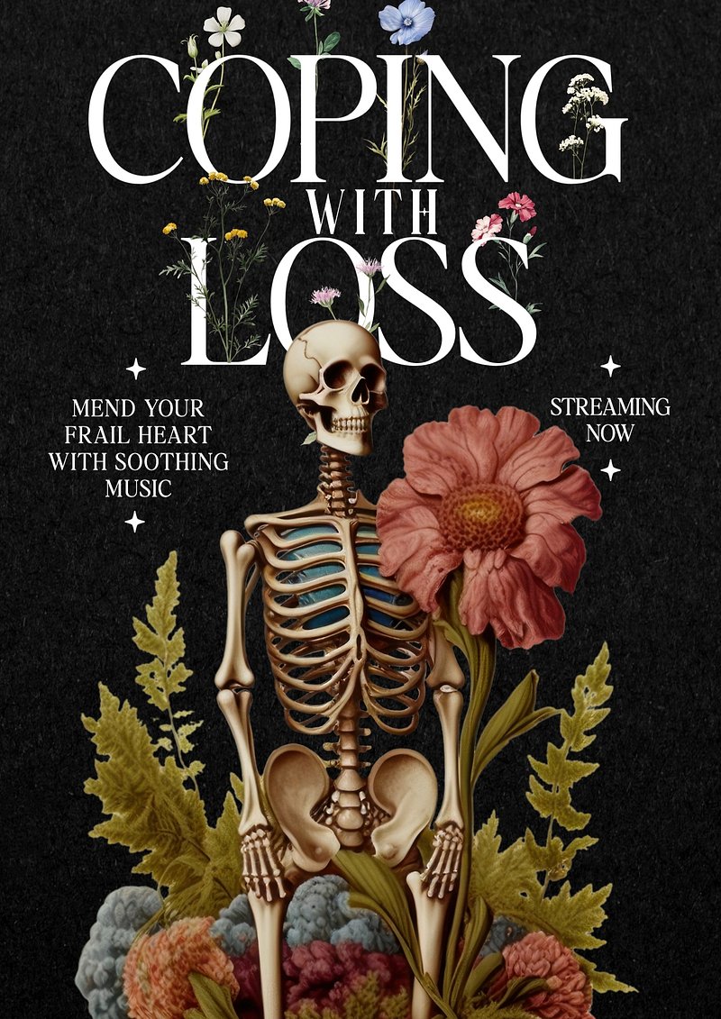 A skeleton holds a large flower, surrounded by colorful blooms. Text reads 'Coping with Loss' and 'Mend Your Frail Heart… https://www.rawpixel.com/image/18305181/image-background-png-heartView license