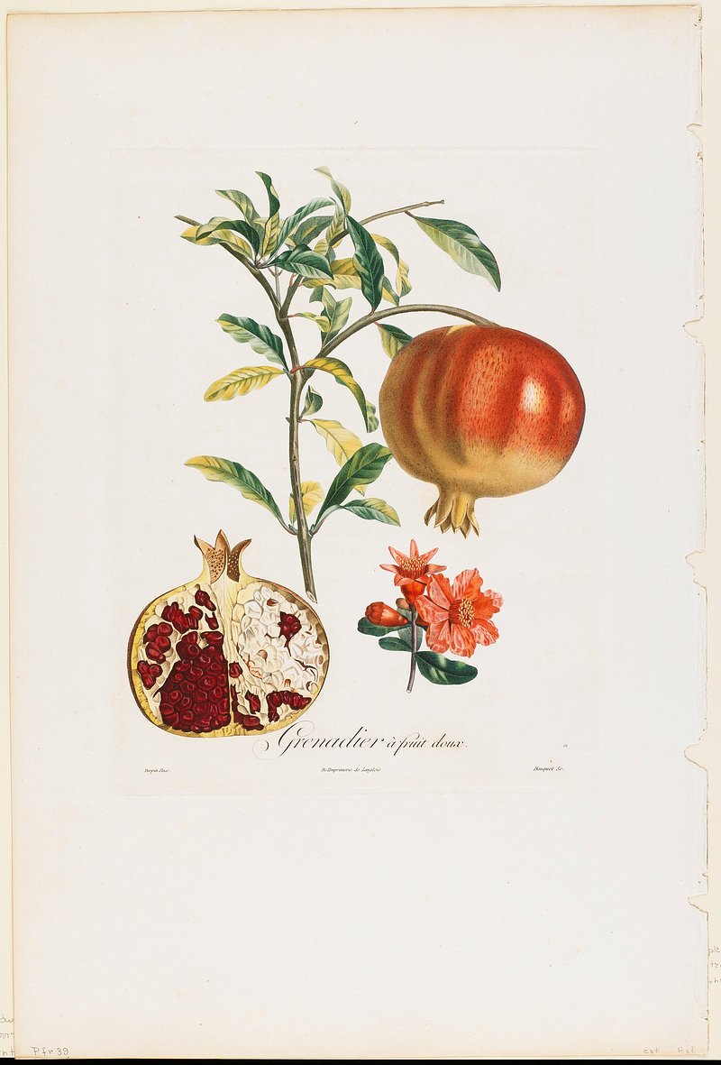 Pomegranate (Punica granatum) from Traité des Arbres et Arbustes que l’on cultive en France en pleine terre (1801–1819) by… https://www.rawpixel.com/image/568448/pomegranate-fruitFree Image from public domain license