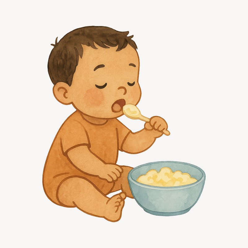Adorable baby eating porridge illustration. https://www.rawpixel.com/image/19426783/adorable-baby-eating-porridge-illustrationView license