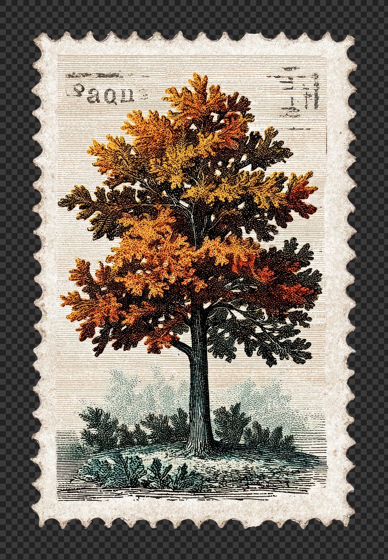 PNG Autumn oak tree vintage postage stamp. https://www.rawpixel.com/image/19170208/png-autumn-oak-tree-vintage-postage-stampView license