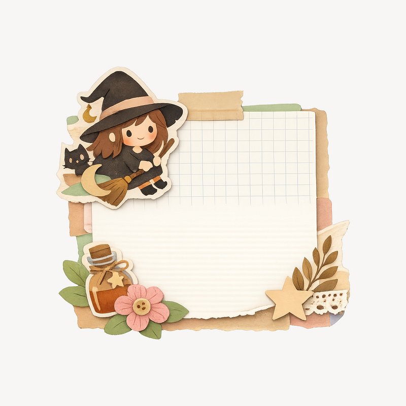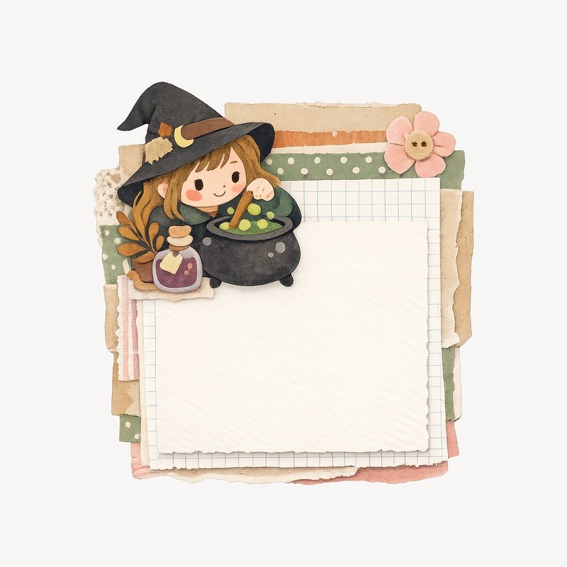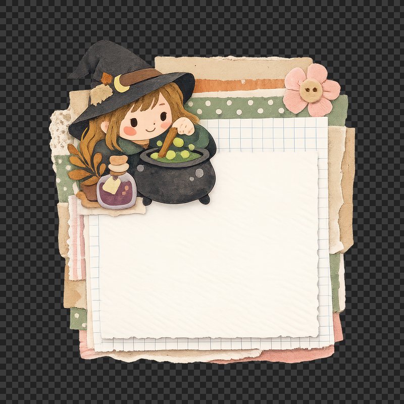 Cute witch scrapbook design template. https://www.rawpixel.com/image/25772174/cute-witch-scrapbook-design-templateView license
