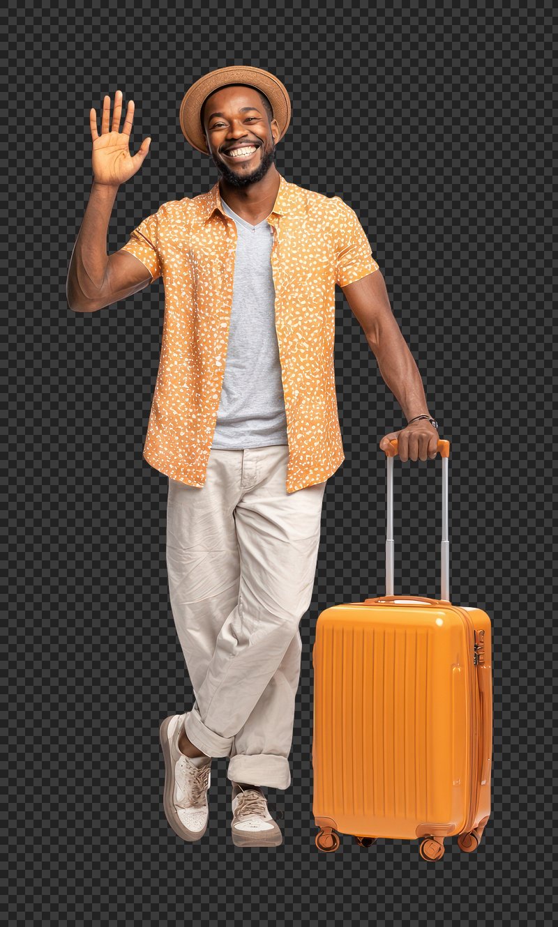 PNG Happy traveler with suitcase waving. https://www.rawpixel.com/image/25815372/png-happy-traveler-with-suitcase-wavingView license