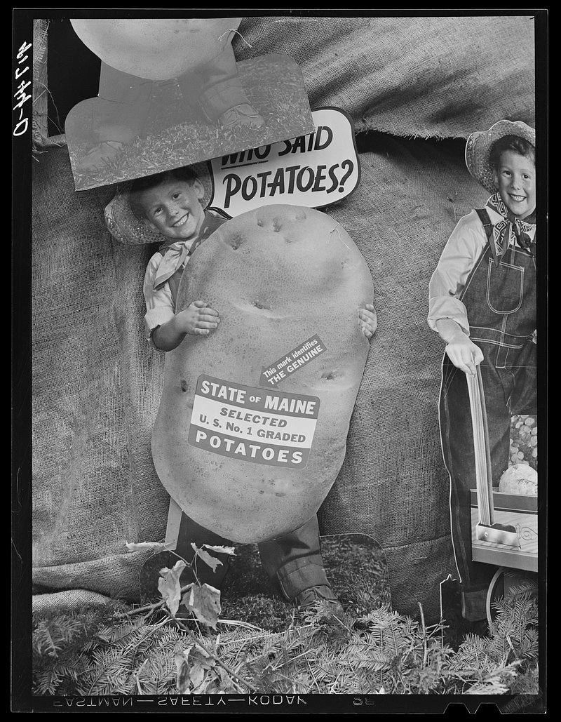 Advertisements for Maine potatoes used as decorations during the barrel rolling contest in Presque Isle, Maine https://www.rawpixel.com/image/6285997/photo-image-people-vintage-public-domainFree Image from public domain license