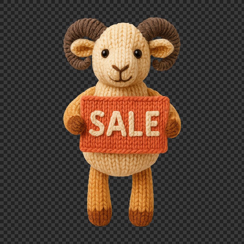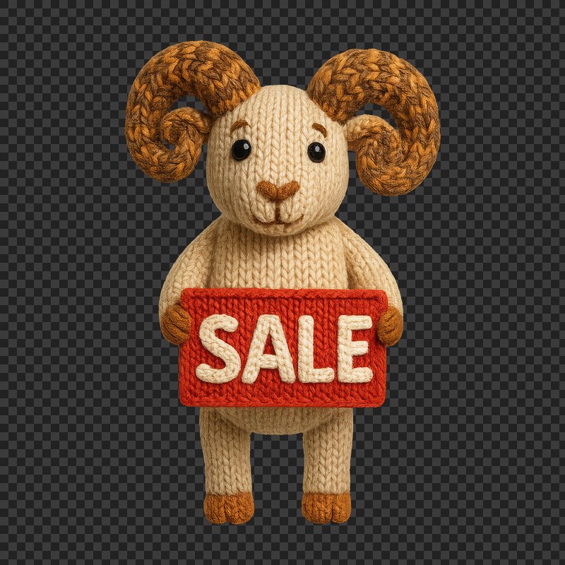 PNG Knitted ram holding sale sign. https://www.rawpixel.com/image/24524447/png-knitted-ram-holding-sale-signView license