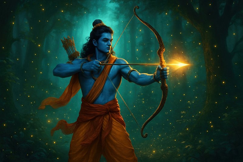 Shri Rama shooting an arrow at Ravana, the ten-headed demon. Gouache painting by an Indian artist. https://www.rawpixel.com/image/13969161/image-arrow-cartoon-personFree Image from public domain license