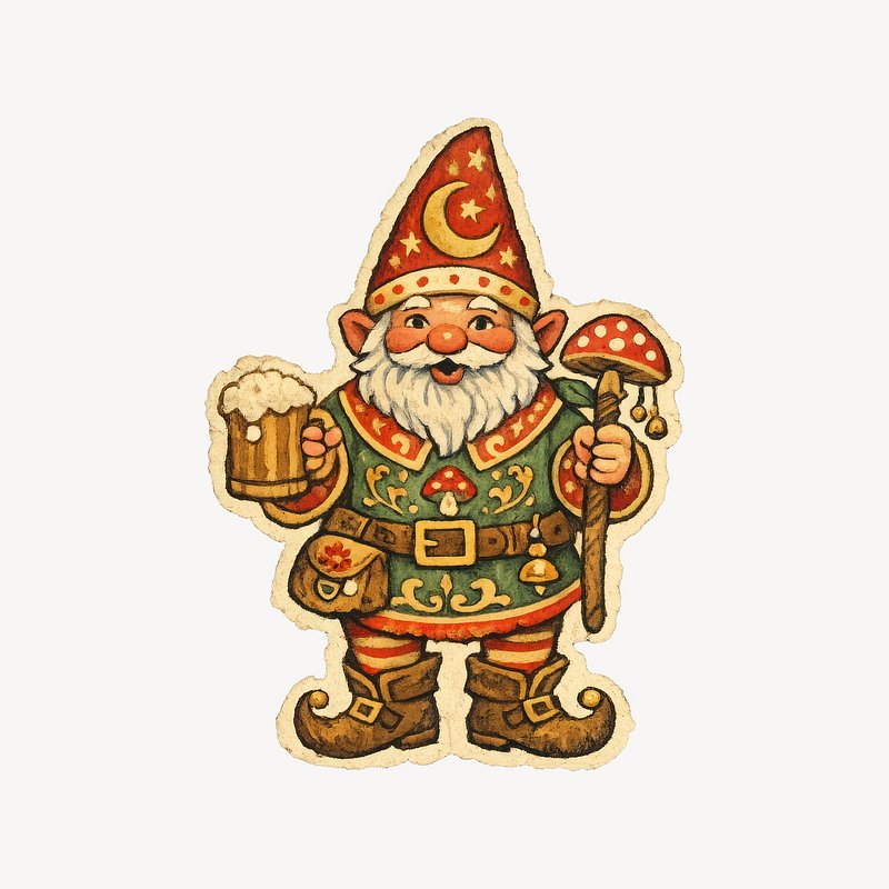 Whimsical gnome with beer. https://www.rawpixel.com/image/25537119/whimsical-gnome-with-beerView license