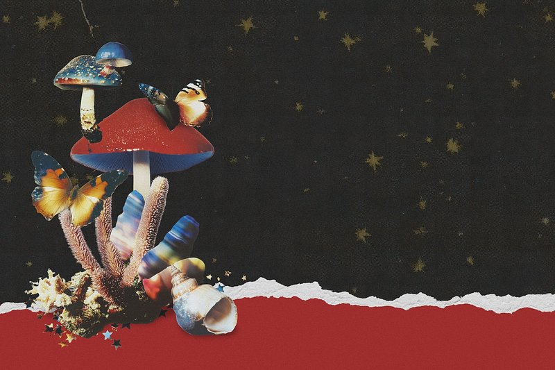 Surreal collage of mushrooms and butterflies on a starry black background retro vintage collage template design https://www.rawpixel.com/image/22773622/image-background-png-abstractView license