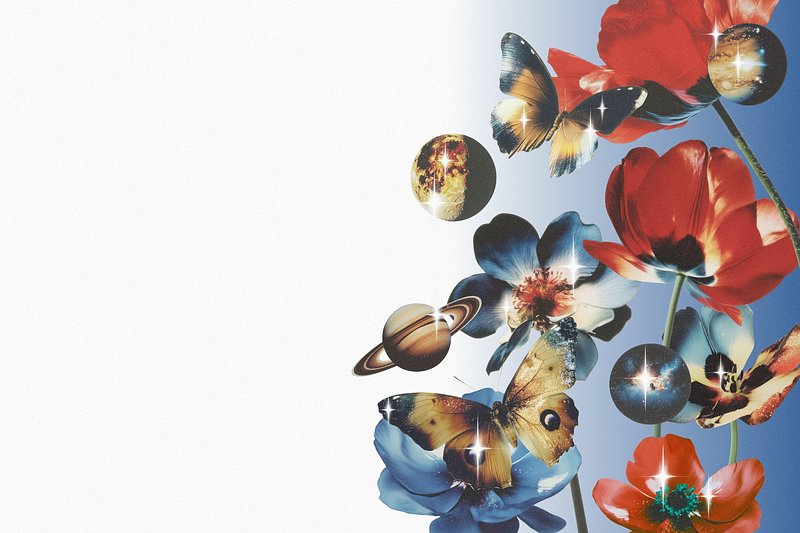 Colorful flowers and butterflies with planets on a white and blue gradient background retro vintage collage template design https://www.rawpixel.com/image/22773629/image-background-png-abstractView license