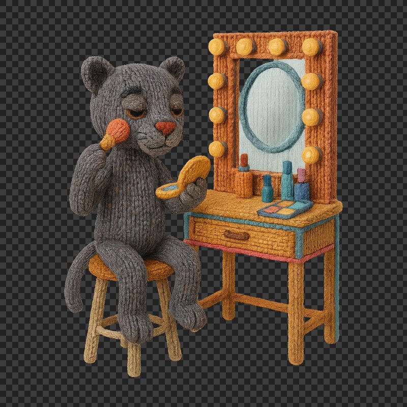 PNG Knitted cat applying makeup joyfully. https://www.rawpixel.com/image/24477495/png-knitted-cat-applying-makeup-joyfullyView license