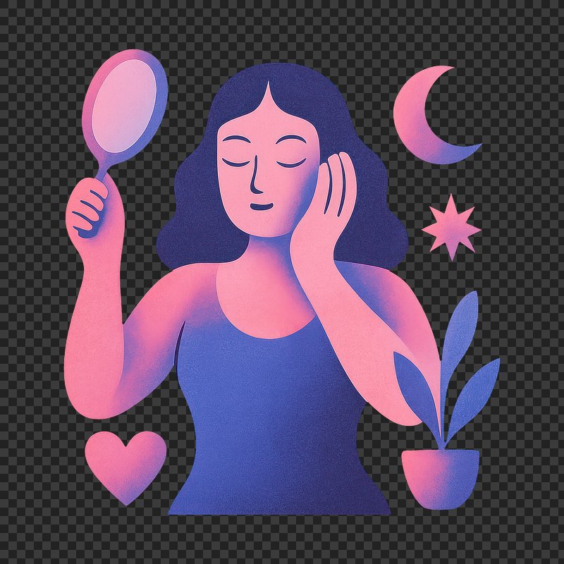 Woman png looking at mirror sticker, self-love illustration, transparent background https://www.rawpixel.com/image/8874230/png-aesthetic-stickerView license